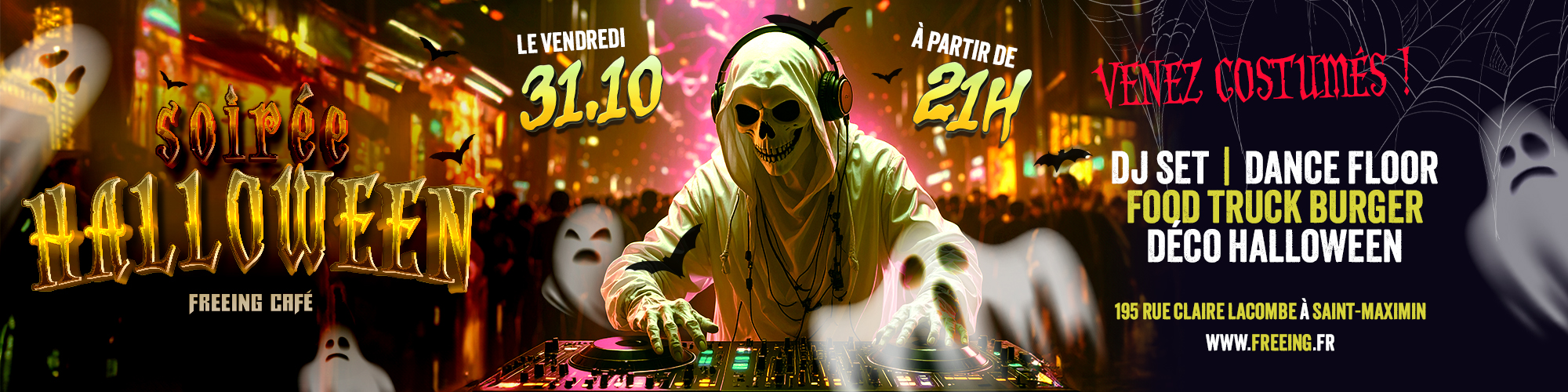 Cette année encore, FREEING CAFÉ se transforme en antre des esprits pour une soirée Halloween monstrueuse ! Venez masqués, maquillés ou costumés, et plongez dans une ambiance frissonnante entre musique, gourmandise et bonne humeur.